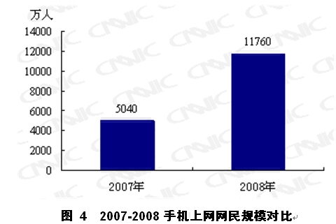 中國互聯(lián)網(wǎng)絡信息中心(CNNIC)今天下午在京發(fā)布的《第23次中國互聯(lián)網(wǎng)絡發(fā)展狀況統(tǒng)計報告》透露,截至2008年,使用手機上網(wǎng)的網(wǎng)民達到1.176億人,較2007年增長一倍多。