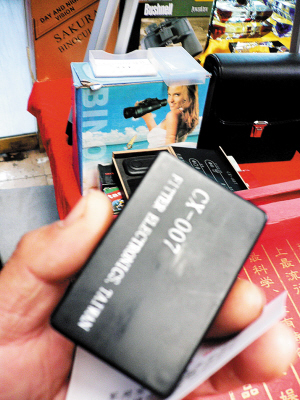 昨天上午,在某洋貨市場內六區一家名為大帆世界精品屋門前的攤位上,一則廣告引起不少客人注目。只見廣告上赫然標明銷售“手機竊聽器”。得知有人詢問竊聽器,這名南方口音、40多歲的攤主顯得很謹慎,不停打量著記者。經過幾番交談,攤主看不出什么破綻,才小聲說道:“這東西不是隨便賣的,我就給你講講吧。只要你買任何一張手機卡插到里面,再將裝置放在你需要竊聽的地方。使用時,你只需要撥打裝置里的手機號碼,就可以聽到那個地方的聲音了。因為你使用的是手機竊聽,所以無論多遠都可以,只要有信號就行。”