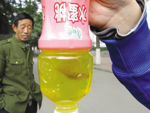 10月23日上午,記者在甘肅政法學(xué)院門前見到于先生,他手中拿著這個(gè)滿是漂浮物的飲料瓶。記者看到,飲料瓶中有很多漂浮物,有的象茶葉,有的象樹葉。該飲料的生產(chǎn)日期為:20080622,生產(chǎn)批號(hào)為:21:12LB2。