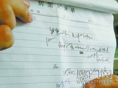 1日下午,在市內某大醫院的兒科候診區,記者隨手向一名帶孩子前來復診的家長借了份病歷,一看就懵了:除了“09.2.1”的日期和表示藥物劑量的幾個阿拉伯數字能看清,其他字跡根本無法辨認。“醫生寫字都是這樣。”這位家長說,他從來就不去看病歷,看了也看不懂。