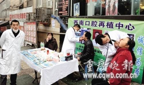 記者立刻前往調(diào)查,發(fā)現(xiàn)這三名中年男子身著白大褂,白大褂上印有“重醫(yī)大附二院”等字樣,面前的一張桌子上,擺滿了假牙、醫(yī)藥棉花和一些瓶瓶罐罐及資料。“我們都是大醫(yī)院的醫(yī)生,周末出來治病兼宣傳。”見一中年男子湊上來,著白大褂的一男子立即熱情招呼,隨即拿起手術(shù)鉗就往患者口腔里插。