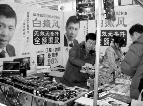 這位工作人員說,一旦馮小剛把他們告了,他們沒錢賠給馮小剛,就有機會讓馮小剛使用他們的藥,治療白癜風。這家藥品企業的做法也的確產生了效果,不少人圍著展臺,“馮小剛給代言的啊?”“馮小剛有白癜風?”