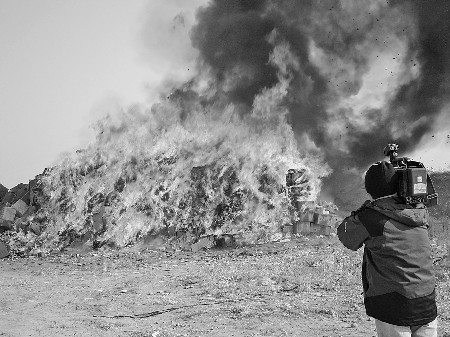 上午10:30左右,在經(jīng)過假劣藥械移交銷毀簽字儀式之后,點(diǎn)火開始。出席現(xiàn)場會(huì)議的相關(guān)領(lǐng)導(dǎo)首先點(diǎn)燃火把,引燃了浸透柴油的“藥山”。火苗躥起幾十米高,熊熊的火焰頓時(shí)吞噬了數(shù)以萬計(jì)的偽劣藥械。熱浪掀起的滾滾濃煙中不時(shí)傳來響亮爆炸之聲,不少灌裝液、氣體藥瓶被炸得飛上了天。