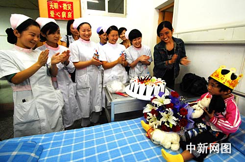 “祝你生日快樂, 祝你生日快樂”, 9月28日上午9時許,從江西九江學院附屬醫院住院部八樓的光明.微笑愛心病房里傳出歡快的生日祝福歌,醫護人員正在給小患者小胡慶祝生日。