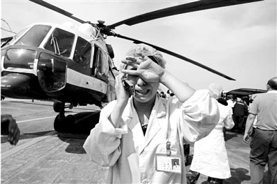 昨天下午4點05分,東方通用航空公司的一架米1-71直升機緩緩降落在廣漢機場停機坪上。艙門打開,40歲的女護士杜娟下了飛機,招呼著成都120急救中心的醫護人員將傷員抬到急救車上。杜娟是北川縣禹里羌族鄉衛生院的護士。5·12地震后,禹里與世隔絕,直到昨天才等到直升機將重傷者送出。杜娟隨機照顧患者。傷員都下了飛機后,杜娟向于波借手機,電話打通時,她手開始顫抖,撕心裂肺的哭聲終于無法忍住。那是她六天后,第一次給外面的親人打電話。巨大的螺旋槳轉動聲中,人們只能依稀聽到她的哭訴:“我要去找他,不能連個尸體都沒有!庇诓乜粗,不到一個小時前,他還覺得這個女護士嚴厲得有點過分。