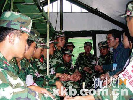 “300名孩子的尸體都堆在學校。我們就在不遠處扎營,晚上夢見死去的孩子們全部站起來了朝我走過來……”戰士小駱流著淚抓住心理救援隊專家的手訴說著。前日,廣州心理救援隊來到了廣東公安邊防總隊某支隊,在帳篷里為115名官兵進行心理輔導!皯鹗總冊诰仍畷r遇到的問題已經超過了他們的承受范圍,他們急需心理輔導。”和戰士們交流之后的胡慎之醫生表達了自己的擔憂。