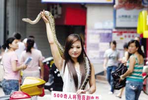 這名自稱叫“優(yōu)優(yōu)”的年輕女子說(shuō),她今年22歲,陜西人,曾是專業(yè)舞蹈演員。她從小不怕蛇,3年前自己養(yǎng)起了蛇,剛開(kāi)始由于缺乏專業(yè)養(yǎng)殖知識(shí),死了好幾條蛇,她為此十分難過(guò)。現(xiàn)在她對(duì)“蛇性”相當(dāng)了解,還學(xué)起了蛇舞、印度舞、肚皮舞。優(yōu)優(yōu)指指脖子上的蛇稱,這是條緬甸蟒,10多斤重,進(jìn)食胃口很大,不僅要吃豬肉,而且一次能吃七八只和鴿子差不多大小的鳥(niǎo)。由于養(yǎng)蛇,這幾年來(lái)優(yōu)優(yōu)一直單獨(dú)一人居住,“沒(méi)幾個(gè)人不怕蛇的,我只能帶著蛇單獨(dú)過(guò)。”帶蛇來(lái)“逛”山西路,優(yōu)優(yōu)另有目的,她背后的胡導(dǎo)稱,他計(jì)劃花5年時(shí)間搜集500個(gè)奇人,拍攝奇人喜劇電影,讓他們展示各自絕技,目前有人愿出數(shù)百萬(wàn)拍攝。