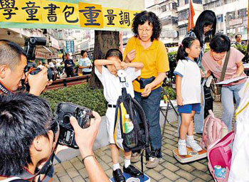 香港學童書包超重嚴重,雖然醫學界建議書包重量不超過體重10%,但早前民建聯 一項調查顯示,香港學童書包重量平均達3.9公斤,最重更達7公斤,其中有一年級學童書包超重最為嚴重,平均比標準重量高出近49%。