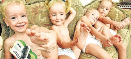自從采取這一“腳趾頭”文身點痣的區分法后,布里德拉夫再也沒有搞錯過同卵四胞胎女兒的身份。即使她們的外貌再相似,只要她們伸出自己的小腳丫,就會泄露出各自的身份秘密。謝莉高興地說:“我們現在再也不會搞錯她們的身份了。”