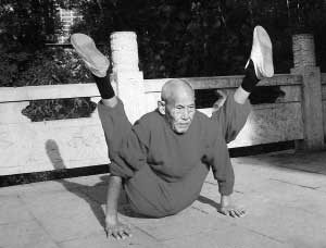 雙手撐起90多斤的身體,再將雙腳扛在肩頭,叼起硬幣。家住湖北武昌的88歲肖清連爹爹昨表演了他自創的絕活——蛤蟆功。