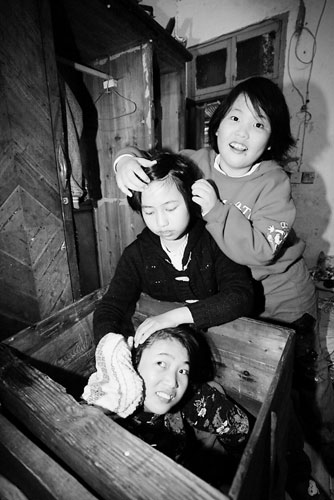 正對著門是一個長一米、寬半米、高約90厘米的木頭箱子,曾之的姐姐竟然就坐在箱子里!“姐姐站不起來,如果在床上或者別的地方就會亂爬,還會揀地上的臟東西吃,實在沒辦法只能讓她坐在這里面。”曾之邊說邊幫姐姐理了理頭發,與姐姐相比,曾之明顯瘦弱許多,臉色也比姐姐黃。