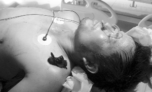 在同仁醫(yī)院急診室,記者見到了受傷的民工。他躺在病床上動彈不得,兩邊耳廓后面還在流血,左邊肩部,一根比拇指還粗的螺紋鋼筋,從腋下一直穿到肩部,肩膀外面露出一寸多長的鋼筋頭。鋼筋還被一層布包著,那是民工的衣服,鋼筋戳到他時,衣服也被一起戳進了肉里。