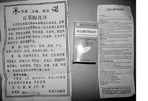 該藥是日前在對(duì)我省部分市縣藥品市場(chǎng)的監(jiān)督檢查中發(fā)現(xiàn)的。在其外包裝上,藥品名稱標(biāo)示為 “DEXAMETHASON”,生產(chǎn)企業(yè)標(biāo)示為“THUOC BAN THEO DON”,包裝盒內(nèi)另附有一份“百茶梅花丹”的中文說(shuō)明,稱該藥為泰國(guó)萬(wàn)和藥業(yè)生產(chǎn),是所謂進(jìn)口藥品,為東南亞“抗炎消腫止痛之圣藥”。