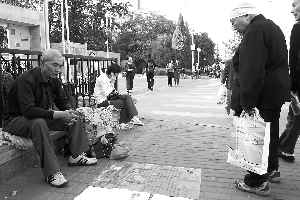昨日下午,陳松發(fā)在人民大學(xué)東門(mén)旁的便道上乞討,一名過(guò)路的女士掏出420元錢(qián)塞進(jìn)陳松發(fā)手中,頭也不回地走了。陳松發(fā)的弟弟趕緊追了上去。