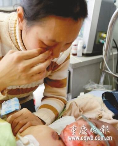 昨日(12月25日),在重醫附屬兒童醫院病房,文文在監護儀的監視下,奄奄一息。醫生稱,文文傷情特別嚴重,頭部頸部大面積燙傷。