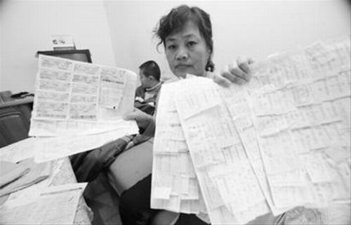 為給明明治病,一家人四處奔波,攢下一堆票據。 記者 樸峰 攝