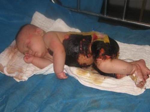 昨日(12月30日),記者在187醫院燒傷科307房看到,男嬰黃堂國躺在床上,前胸、右腿和臀部等被嚴重燙傷,燙傷處被涂上了厚厚的藥膏。黃堂國的父母在病床前不停嘆息,“因借不到錢,現在醫院已經停止對孩子用藥了。”黃堂國的母親告訴記者,她家住海口市龍華區遵譚鎮群力村委會美萬村。12月19日晚,她正準備給孩子洗澡,當時先往盆里放熱水,正想放冷水時忽然想起忘了給孩子拿衣服,就在她出去拿衣服時,孩子不慎掉進了熱水盆,“當時孩子被燙得哇哇直哭”。