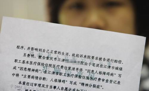 昨日,小玫趕到重慶向記者出示了調解書。法院查明,當初醫院在小玫醫保住院醫療費結算清單中將“因患人格障礙病”寫成“因患精神病”和在“職工醫保費用審查登記表”病情診斷一欄中將“人格障礙”寫成了“精神分裂癥”,都是筆誤。經過調解,醫院愿意將上述兩處“筆誤”改過來,即把精神病的鑒定刪去,不過依然保留對患者有“人格障礙”的結論。小玫說作為調解的條件,她放棄了6萬元的索賠請求。