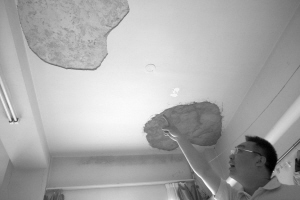 就在記者了解情況過程中,侯女士不斷出現惡心、嘔吐等癥狀。“這房子也太不結實了,去年10月份臥室靠近窗戶的天棚就掉了一塊墻皮,好在家里沒人,后來我們自己用水泥抹了一下。”當天,倪先生找到了負責小區開發的哈爾濱新陽開發公司,但等了3個多小時也沒見到相關負責人。