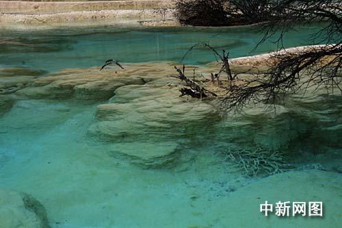 整個(gè)山谷幾乎全被乳黃色的碳酸鈣質(zhì)覆蓋,從高處看去,宛若一條從岷山雪峰飛騰而下的黃龍,景區(qū)由此得名。一層層的碳酸鈣形成層層疊疊的梯狀湖泊、池沼,水色因水底沉積物和山色的千變?nèi)f化,而呈黃、綠、淺藍(lán)、蔚藍(lán)等顏色,是名副其實(shí)的“人間瑤池”。