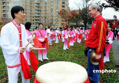 一位來自當地的“洋人”比爾(右)已經多次率領這支鑼鼓隊參加中國文化節日的活動。