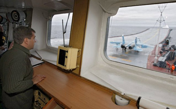 俄總統梅德韋杰夫在庫茲涅佐夫號航母上觀看穩定2008軍演(資料圖)