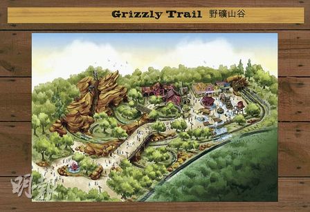 主題園區的故事設定于偏遠淘金小鎮,但大灰熊卻因淘金被觸怒。一班尋金者乘“大野礦山飛車”橫越整個小鎮,但飛車在崎嶇斜坡上突然急速倒駛,一群實物原大的發聲機動大灰熊也會施襲搞破壞,弄得乘客東歪西倒,最后更會觸動炸藥裝置,令飛車從山中高速“噴射”出來。“大野礦山飛車”相信是這次擴建中,刺激度最高的一個設施。