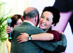 蔣雯麗激動地和朱旭擁抱在一起。 晨報記者 鄒紅/攝