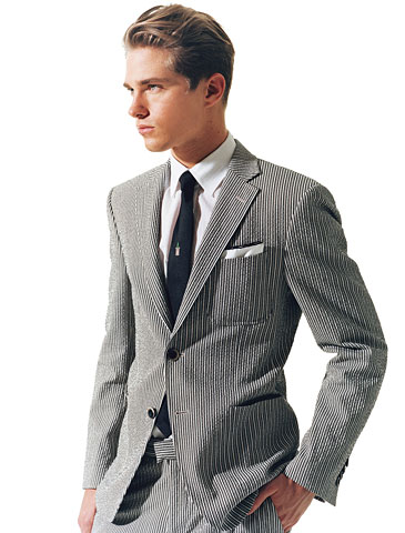 七:條紋外套?肯定!再發(fā)愁你的條紋西裝沒法穿么?的確,如今大概只有四歲的孩子和沒有時尚品味的人才會選擇那種淺色的泡泡紗外套來作為自己的“出場”服裝。但是,告訴你個方法,只要簡單的加上黑色和白色的話,這款搭配就變得相當?shù)挠行汀⒊墒炝恕4钆浒咨囊r衫,黑色的領(lǐng)帶,和一塊口袋方巾,那么無論是日常的辦公或者是小型的PARTY聚會,就都很合適了!!