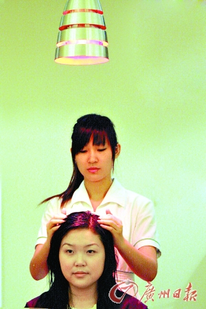 紅外線燈殺菌排毒。紅外線燈能產生熱力使頭蓋保持暖和柔軟,使藥水的治療和營養成分更易吸收,同時能殺菌、減少毒素及有害物資對頭皮、頭發的損害。在上完藥水后一邊照燈一邊進行頭部按摩,可放松緊繃的頭蓋,使配方更易滲透。