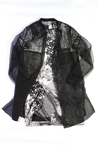抽象的中國剪紙黑白印花,搭配輕透的歐根紗衣,若隱若現,別致高雅。