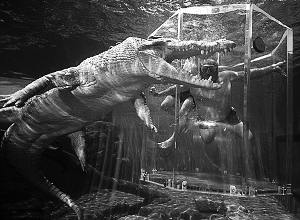 巨大的鱷魚似乎要給“死亡之籠”里的潛水者一個“擁抱”。