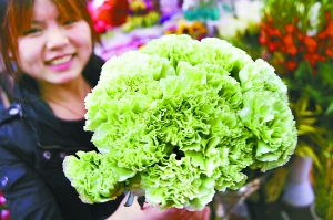 綠色代表健康、充滿活力。大家通常看到的康乃馨大都是紅、黃、粉為主,綠色康乃馨因培植技術(shù)復(fù)雜等原因,極其罕見。在追求環(huán)保、簡約、時尚的三八婦女節(jié)為女性朋友送上一束綠色的康乃馨別有一番寓意。(劉潔攝)