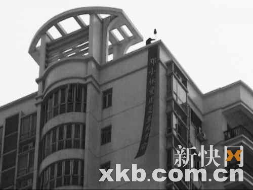 他背后的外墻掛著一條六七米長的紅色條幅,上寫“鄧××愛周×至死不渝”字樣。多名警察在該男子前進行勸說,消防員在樓下鋪設(shè)了2米多高的氣墊。近百名市民站在小區(qū)外面的馬路上圍觀,不少市民還大聲規(guī)勸該男子“想開點”。