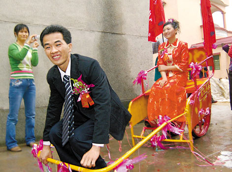 當日下午2時左右,石頭村接龍橋到慈灣村的小道上,鞭炮齊鳴,笑聲不斷。西裝革履的新郎正奮力拉著一輛自制的兩輪人力車,人力車上端坐著漂亮的新娘,紅彤彤的禮服映紅了新娘的臉。新郎是棠下鎮石頭村委會慈灣村人,在棠下工業區的一車廂廠工作,新娘是環市街道辦丹灶村人,兩人已經相識一年,當日喜結良緣。