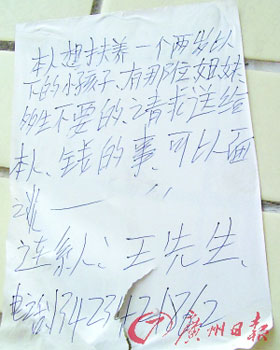 昨日下午,在深圳光明新區公明辦事處上村社區,記者竟然在一棟樓的墻壁上看見一張買小孩的廣告(見左圖)。這是一張用圓珠筆寫成的廣告,署名為王先生的人稱自己想收養一個兩歲以下的孩子,請有多生孩子的姐妹送給自己一個,價錢可以面談。按照廣告上留的電話,記者撥打過去。接電話的女子稱自己和老公結婚多年未孕,想收養一個孩子,只好寫了小廣告貼在墻上,希望找到合適的孩子。民政部門的負責人表示,這種街頭廣告收養小孩的方式顯然是不合法的,并提醒市民千萬不要上當受騙。(記者 阮曉光攝)