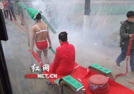“誰若97歲死,奈何橋上等三年!比绻堰@句歌詞中纏綿悱惻的場景搬到婚禮中演繹,會不會有點驚悚?25日上午,網友“鍋爐工”在紅網論壇發帖,再現了一場“雷人”婚禮,帖子描述道“這男人扮牛頭,拉個‘投胎轉世車’拖著老婆回家,新娘后面放著幾掛鞭炮,據說是驅鬼用,拉著上‘奈何橋’好恐怖啊!”