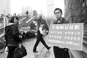3月28日,武昌中南商業大樓前,一青年男子手舉一塊廣告牌,聲稱為身家百萬的艾滋病女患者征婚。舉牌的男子自稱姓鐘,在武漢辦了一網站。該“艾滋女”以9.7萬元租下了他網站的首頁,要求專門為她做征婚廣告,還要求他在中南大樓前舉兩天的征婚廣告牌,她每天給網站1000元的報酬。