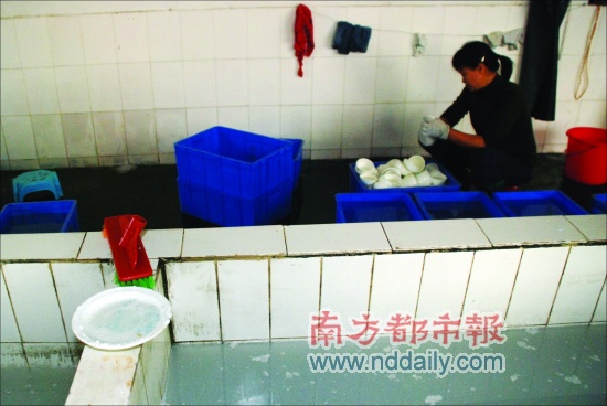 在這些水池旁邊,還有四五個盛滿水的藍色塑料箱,有一個箱子里表面上浮著泡沫,另外幾個的水則相對較清。這些塑料箱里均放滿了各種餐具,旁邊的地上還放著各種餐具,三四名女工正圍著這些塑料箱洗碗。一名女工表示,箱子里分別是洗潔精、漂白水和清水,用洗潔精洗過后,放在漂白水里漂兩次,再在清水里涮一下就行了。記者發現,箱子里的水長時間不更換,即使是清水也有一股濃濃的異味。