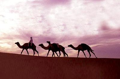 騎駱駝是沙漠之旅的重要環節之一,進入沙漠,馳騁在雄偉空曠的茫茫沙海之中,盡享“鞍上樂趣”。視線所及之處,都是沙山。連綿起伏的沙丘,映襯著蔚籃的天空,在明亮的陽光下,猶如金色的山峰。當微風輕輕吹過,兩邊一望無際的沙漠便卷起星星點點的黃沙,在前方的公路上旋轉、飄舞。
