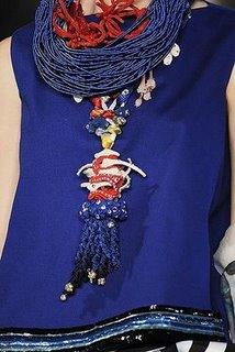 這串頸飾有些夸張,卻富有創(chuàng)意。使用紅白藍(lán)三色搭配藍(lán)色上衣,顯得十分活潑,也充滿(mǎn)了法蘭西的浪漫。