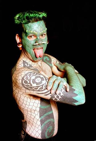 埃里克·斯普拉格,人稱“蜥蜴人”,生于1972年,是“分割舌頭”整容術(shù)的創(chuàng)始人,這種手術(shù)曾一度成為流行趨勢。為了讓自己看起來更像爬行動(dòng)物,這名37歲的男子已經(jīng)在紋身沙龍里度過了700小時(shí)。除此之外,他還在眉毛上方植入了10個(gè)特氟龍材料的“角”,并讓牙齒變得更加鋒利……