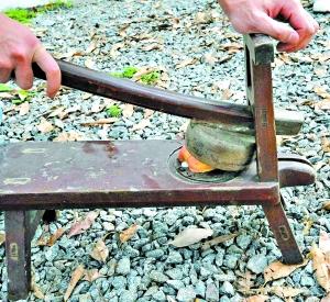 “中國古代早就有辦法做鮮榨果汁了!”林伯手中的“榨汁器”像是一把勺子倒扣在一條小板凳上,將水果放在勺子下,用力擠壓,果汁便會順著木板上的凹槽向下流出。