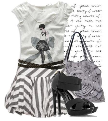 條紋高腰迷你裙加上纏繞式腰帶,顯出纖纖細腰,超高跟的腳踝涼鞋變身時髦女孩。