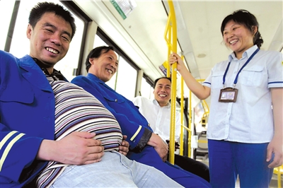 昨天上午,在北京站東街的639公交車總站內,突然多了很多“孕婦”集中乘車。為迎接母親節的到來,車隊讓男司乘人員假扮孕婦,體驗當母親的辛苦。