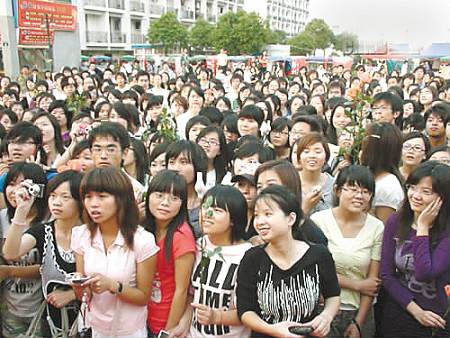昨天下午,這個特殊的慶生派對在寧波一所高校北區宿舍商業區的中心廣場上舉行。下午4點,光鮮的舞臺早已搭好,舞臺上拉著巨幅的噴繪背景,還有樂隊演奏著歡快的樂曲。