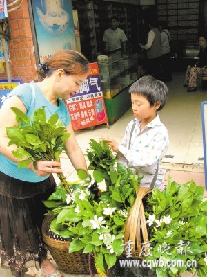 5月19日上午9點,空中飄著零星小雨。沙坪壩區小龍坎新村路入口處,裝滿梔子花的背簍立在人行道上,旁邊蹲著一個短頭發、斜背小包的小女孩。有人走近,她立刻放聲大喊:“梔子花,新鮮芳香的梔子花。