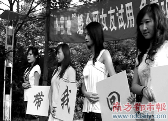 帖子稱:當天在廣州珠江公園和朋友閑逛,碰到一件極其雷人的事情———某婚介所在公園搞‘女友試用’活動,聲稱只要符合相關要求,就可以把現場的美女免費帶回家。要求如下:有車有房,資產過百萬,月收兩萬起。除此之外,告示牌上聲稱,本活動提供三天包退,終身包換的承諾……