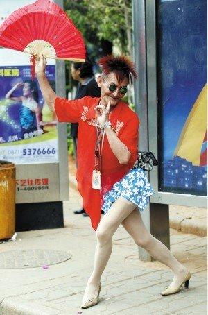 時髦的尖高跟鞋、絲襪、超短裙、艷麗的襯衫、酒紅色的“雞冠頭”……前天中午,在人流、車流如織的小菜園立交橋,這位時髦的“美女”大幅度搖擺著臀部,以妖艷的姿態橫掃著眾人的眼球。而當看清“美女”的正面時,大家的眼珠子差點掉了一地——原來,這位“美女”竟是一位老倌。