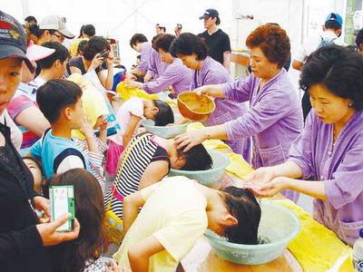 隨后,朋友陪同記者參加慶;顒,記者看到姑娘們用菖蒲根做成簪子別在頭上,男人們則將菖蒲根纏在腰上。朋友說,這象征可以防止頭痛和災厄的發(fā)生。慶;顒又杏泻芏鄡x式,孩子用菖蒲水洗頭發(fā),祈求健康;人們點燃許愿燈,祝愿家人平安。來自農村的民俗表演是整個活動中最熱鬧的。小伙子舞動繪有龍圖案和寫有“農者天下之大樂”等字樣的大旗,身穿韓服的人們邊敲鼓邊圍成圈跳舞,一些人則裝扮成小丑,穿插在隊伍里,場面很熱鬧,他們用這種形式表達豐收的喜悅。朋友說,端午最有代表性的娛樂活動就是女性聚在一起蕩秋千,男人聚在一起摔跤。端午當天,也有將曬干的艾葉放在大門旁邊以除災驅邪的習俗,韓國人喝菖蒲酒,還將扇子作為禮物贈送,不少商家趁此機會熱賣扇子。